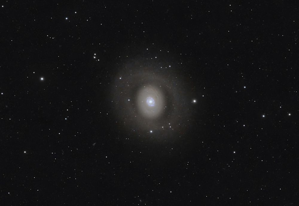 Located in the constellation Canes Venatici. It is 16 million light-years away. The diameter of the main disk is 50,000 light-years. Angular size 14.4'x12.1'. It has two powerful ring-like structures. The inner ring is a site of active star formation, fueled by interstellar gas flowing into the ring from the outer oval bar-like structure. Captured over two days.