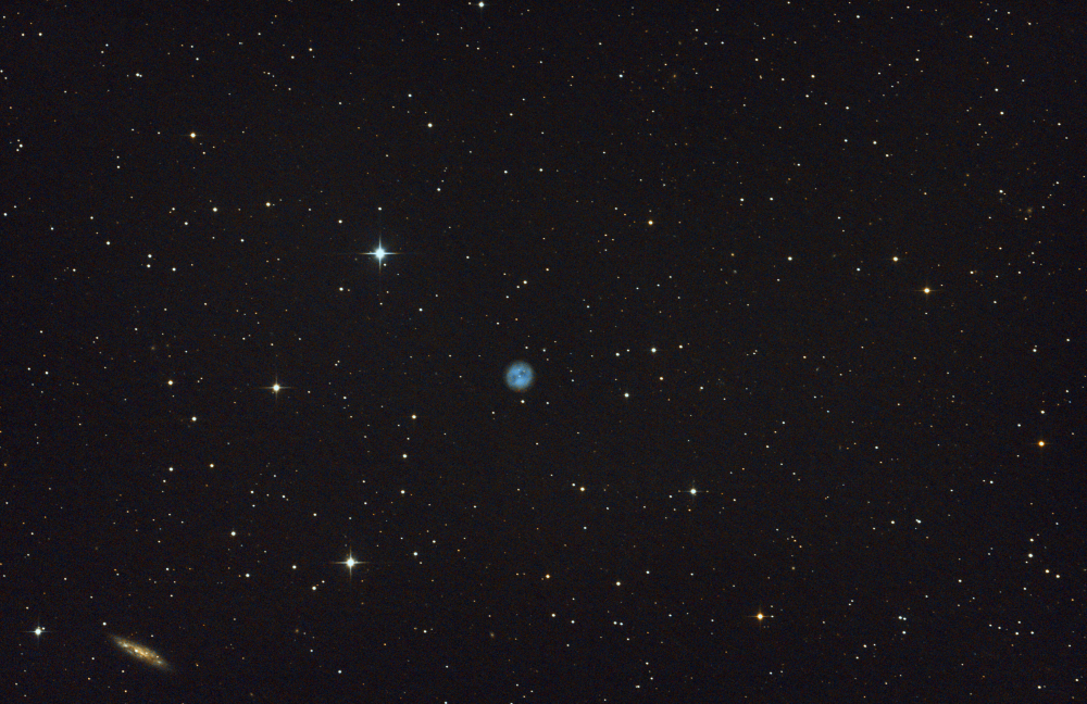 Testing equipment, took 4 frames at 300 seconds each of the planetary nebula M 97 "Owl," with galaxy M 108 "Surfboard" also in the frame. Forgot to lower the ISO here too..