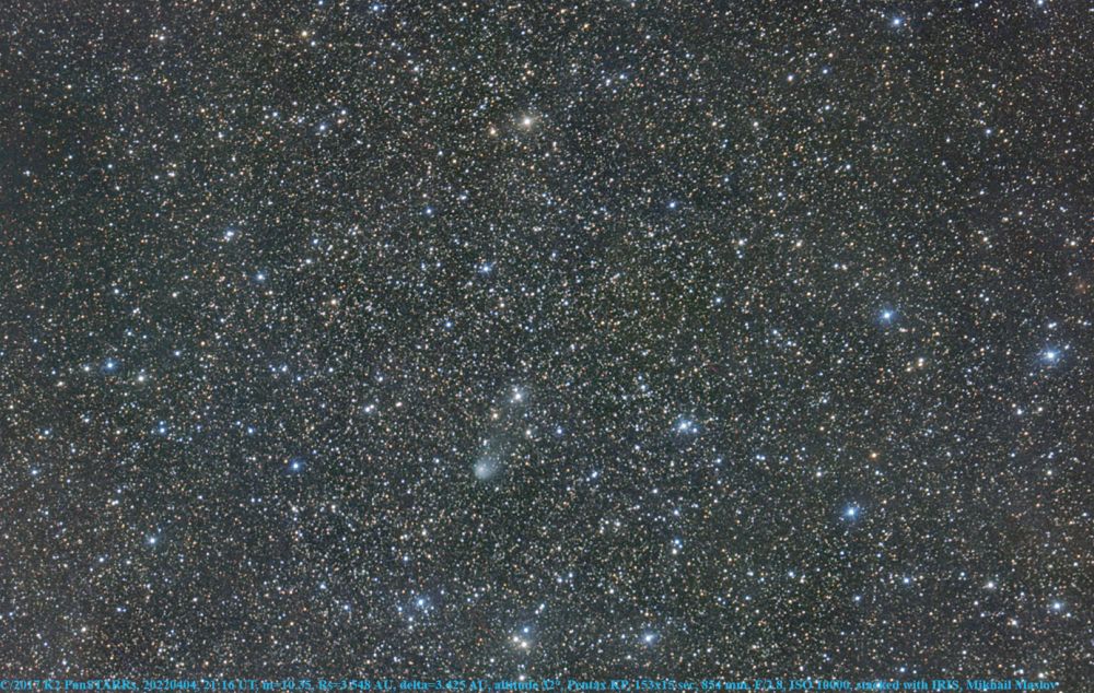 C/2017 K2 PANSTARRS Telescope/Lens: Newtonian 1200mm F/2.8 Camera: Pentax KP Mount: AZ-EQ6 Software: Iris Accessories: ASA corrector-reducer to 854 mm F/2.8 Novosibirsk, Russia Exposure: 15 x 153" ISO/Gain: 10000 Original size: https://deepskyhosting.com/zT9yhtR Author: Mikhail Maslov