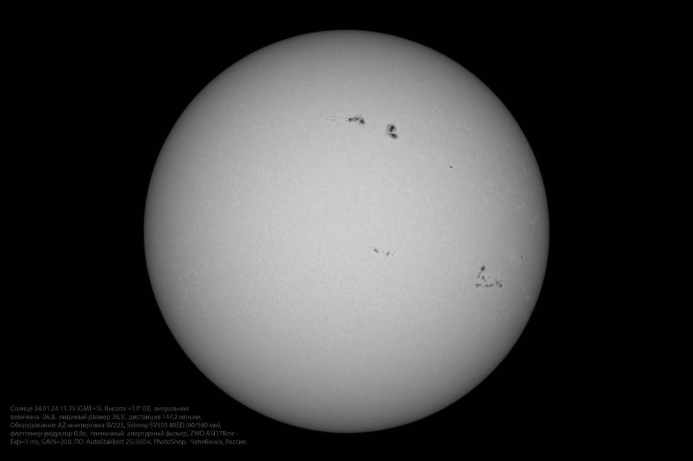 Sun at 11:35 GMT+5 on 24.01.2024. Svbony SV503 80ED, 0.8x flattener-reducer, ZWO ASI178mc, Svbony SV225 AZ mount. SharpCap, PIPP, AS - 25/500, PS.