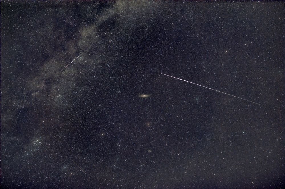 ANDROMEDA GALAXY DURING THE PERSEID METEOR SHOWER Telescope/Lens: samyang 16mm f/2.0 Camera: Canon 600D Mount: Трекер АТ-1(2РВМ) Software: Siril, Gimp Perm, Russia Light Pollution: Yellow zone Exposure: 80 x 60" ISO/Gain: 800 Original size: https://deepskyhosting.com/zxLf9Iy Author: Vlad